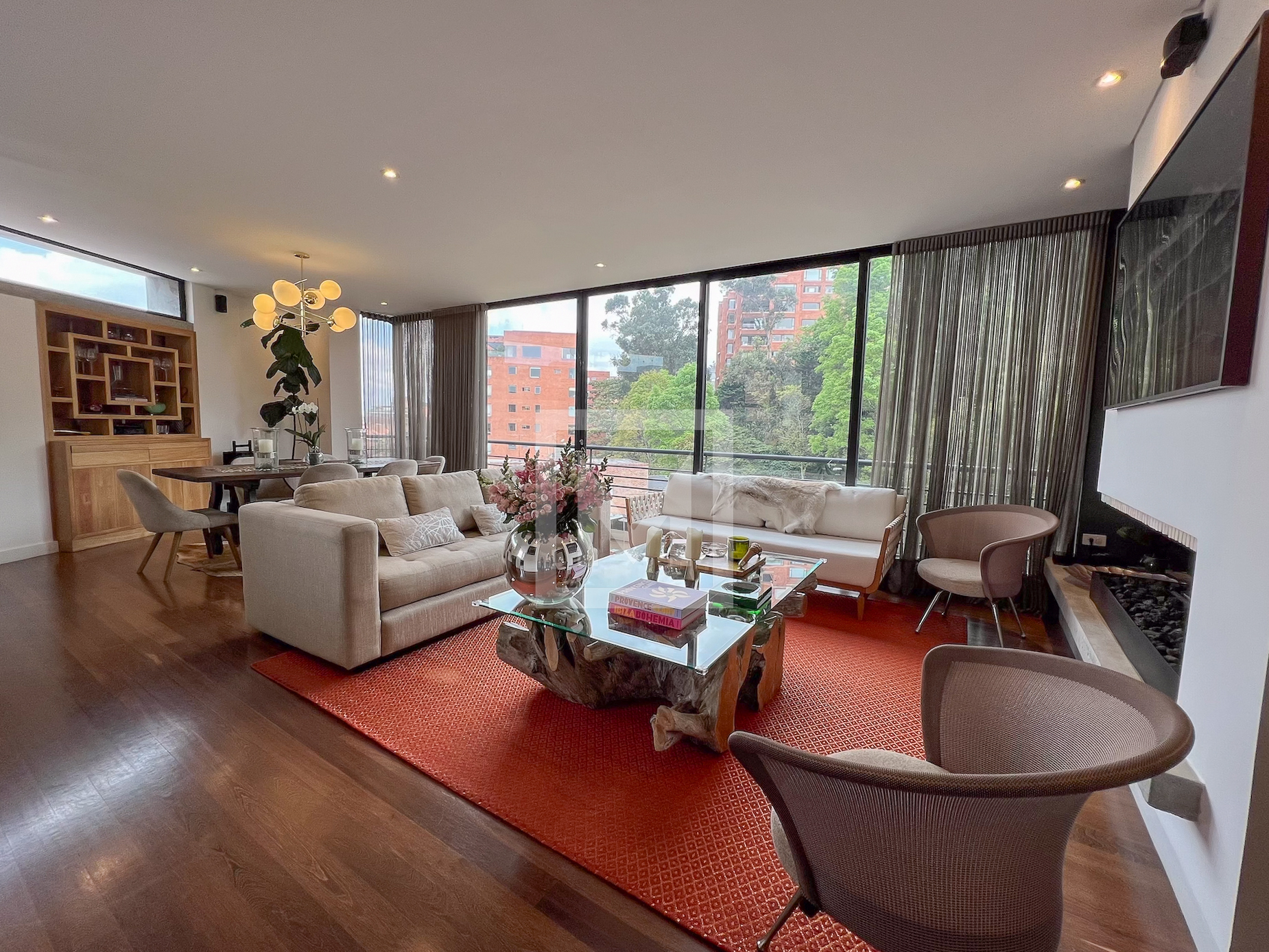 Apartamento exterior rodeado de vegetación y mucha luz. En el piso de acceso se encuentra la sala con una cocina abierta y una terraza con jacuzzi. Arriba encontramos las tres habitaciones cada una con su baño privado y vestier. El apartamento esta completamente domotizado con aire central en las habitaciones, ventanera termo acústica y jacuzzi. Cuenta con gimnasio, zona de niños, vigilancia 24 horas y parqueadero de visitantes.